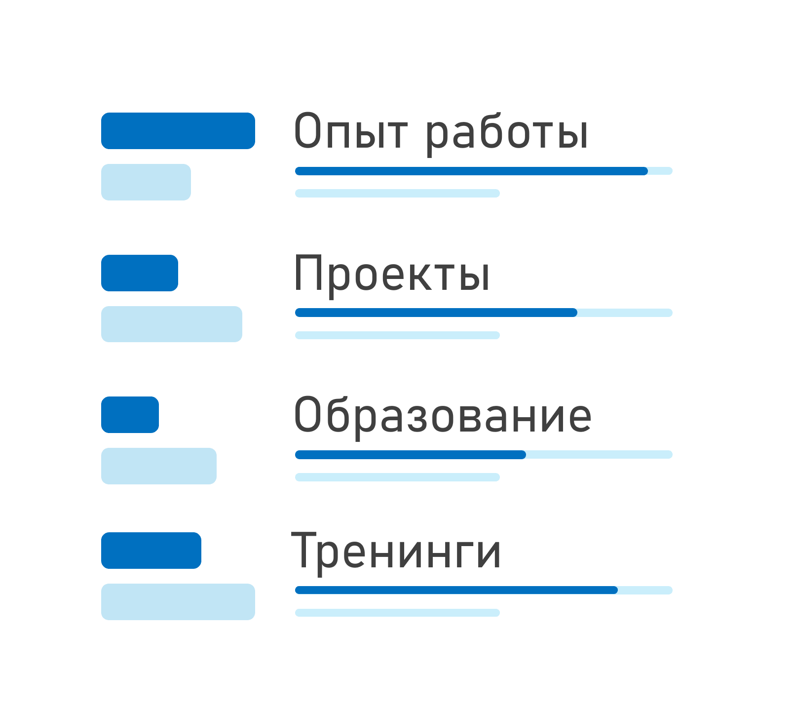 Делитесь данными о вашем опыте работы, достижениях, высшем образовании, пройденных тренингах. Загружайте материалы по проектам, в которых вы участвовали и которыми гордитесь.